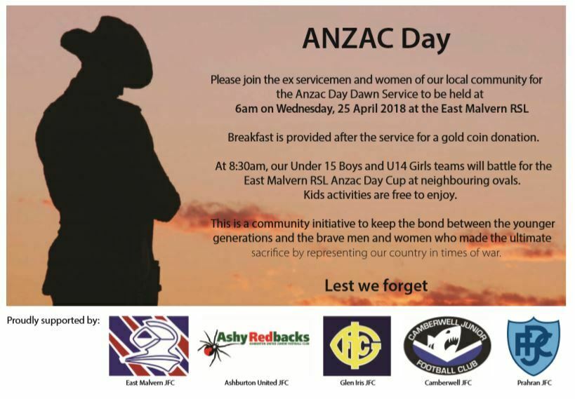 The Club invites all players and their families to please join the ex serviceman and women of our local community for the Anzac Day Dawn Service to be held at 6am on Wednesday, 25 April 2018 at the East Malvern RSL.  The Club would like all players attending to wear their Camberwell Sharks hoodie/jumper as a way of representing our Club at the Dawn Service.